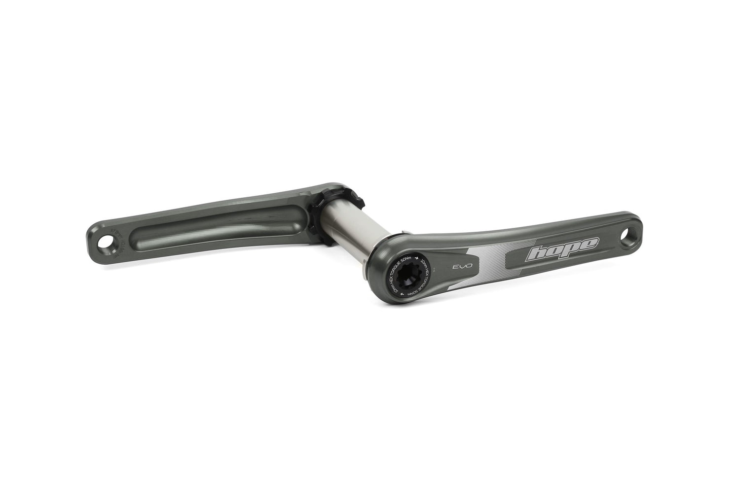 Continued development Hope's popular crankset has led to the EVO Edition, a new benchmark for aluminium MTB cranks. The latest FEA analysis tools, rigorous lab testing and extensive field testing mean the EVO crankset is both lighter and stiffer than the previous model. Now featuring a self-extracting axle/arm interface, simplifying fitting and removal. And all proudly designed, tested and manufactured in Barnoldswick, UK.